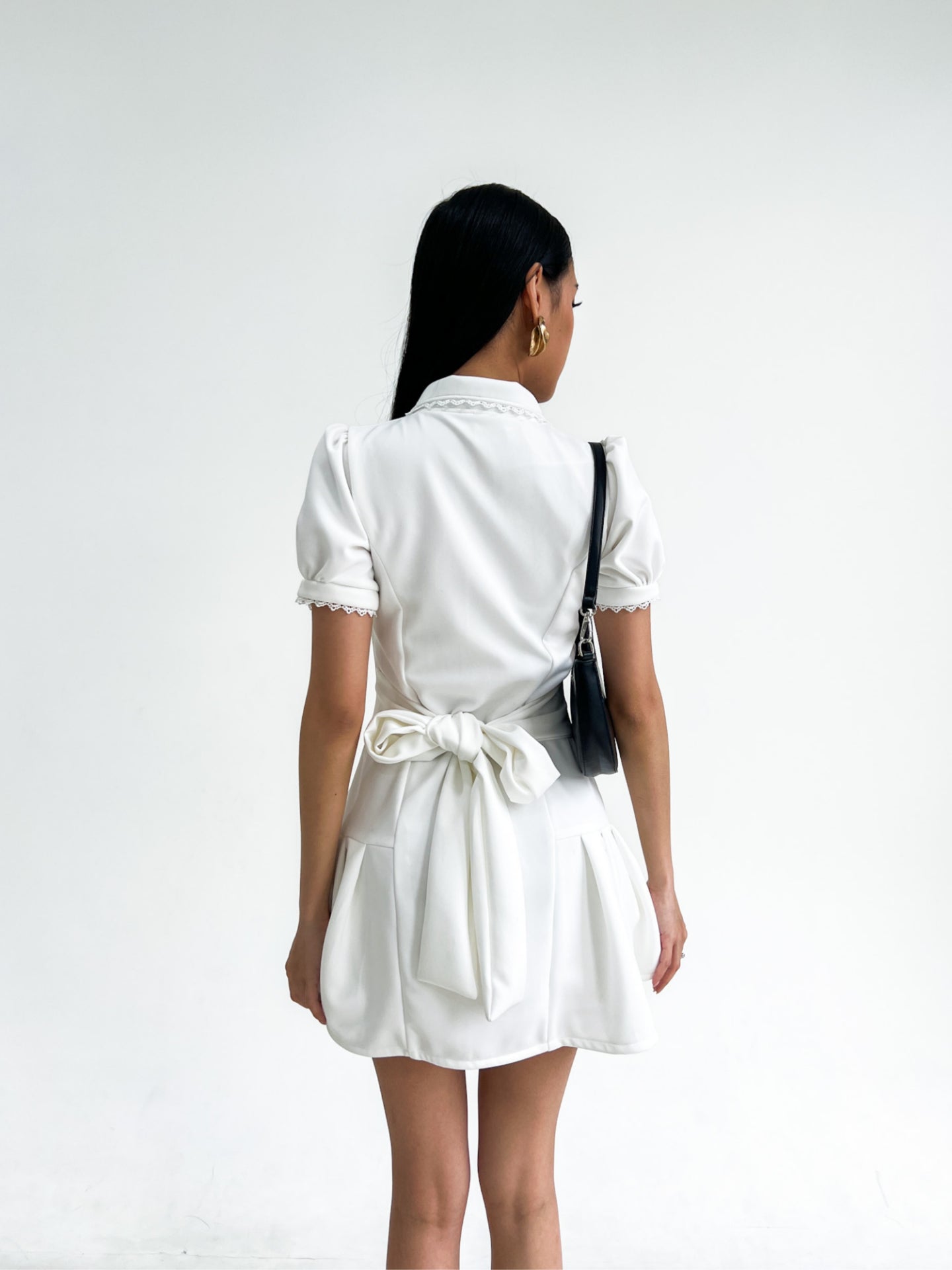 The Darling Dress embodies a playful and chic aesthetic, perfect for fall days. This mini dress is a modern take on classic elegance, making it versatile for day-to-night transitions. Its feminine bow and structured silhouette create a romantic yet bold look.