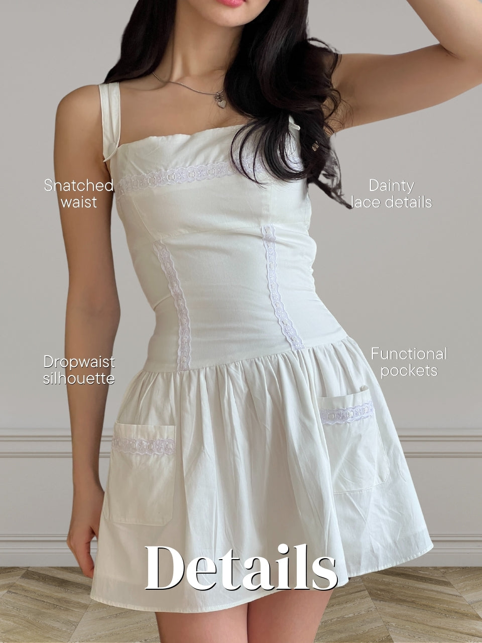 Details: Delicate accents along the bodice and pockets, adding a soft, romantic touch to the dress.