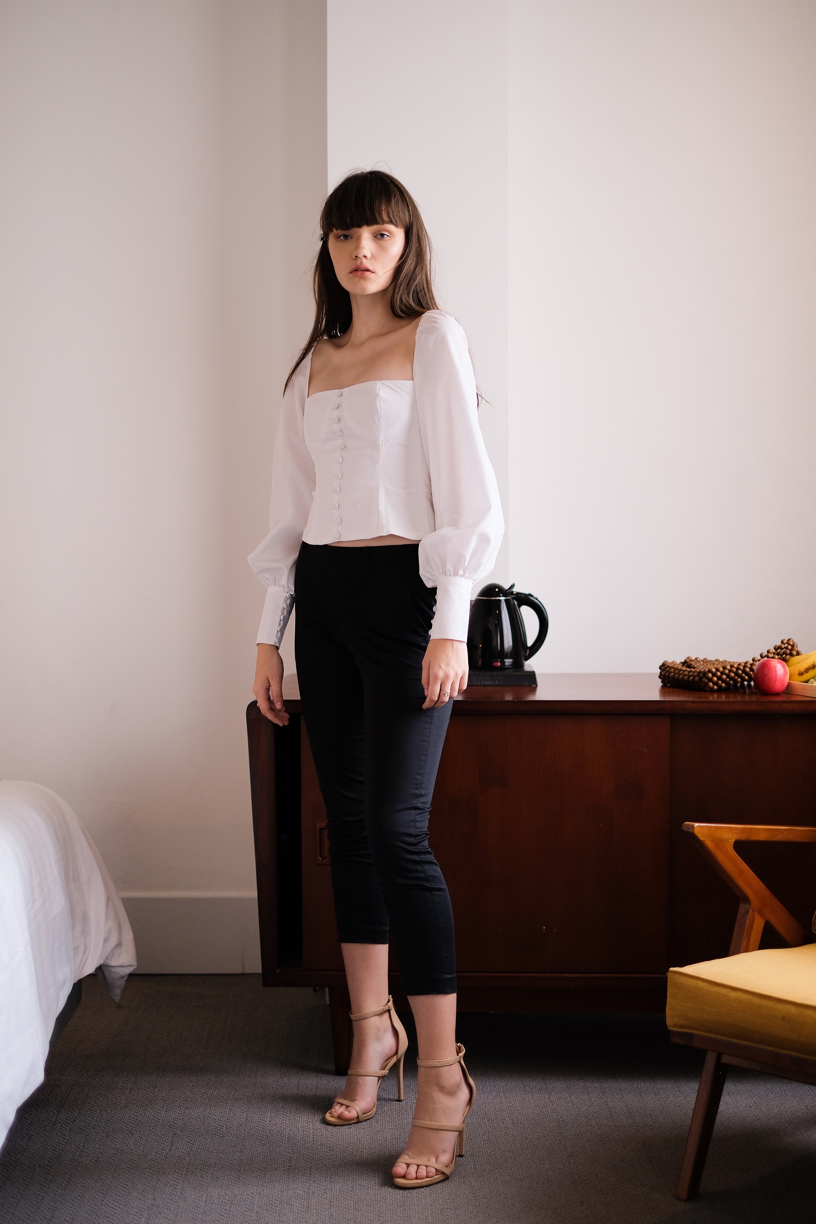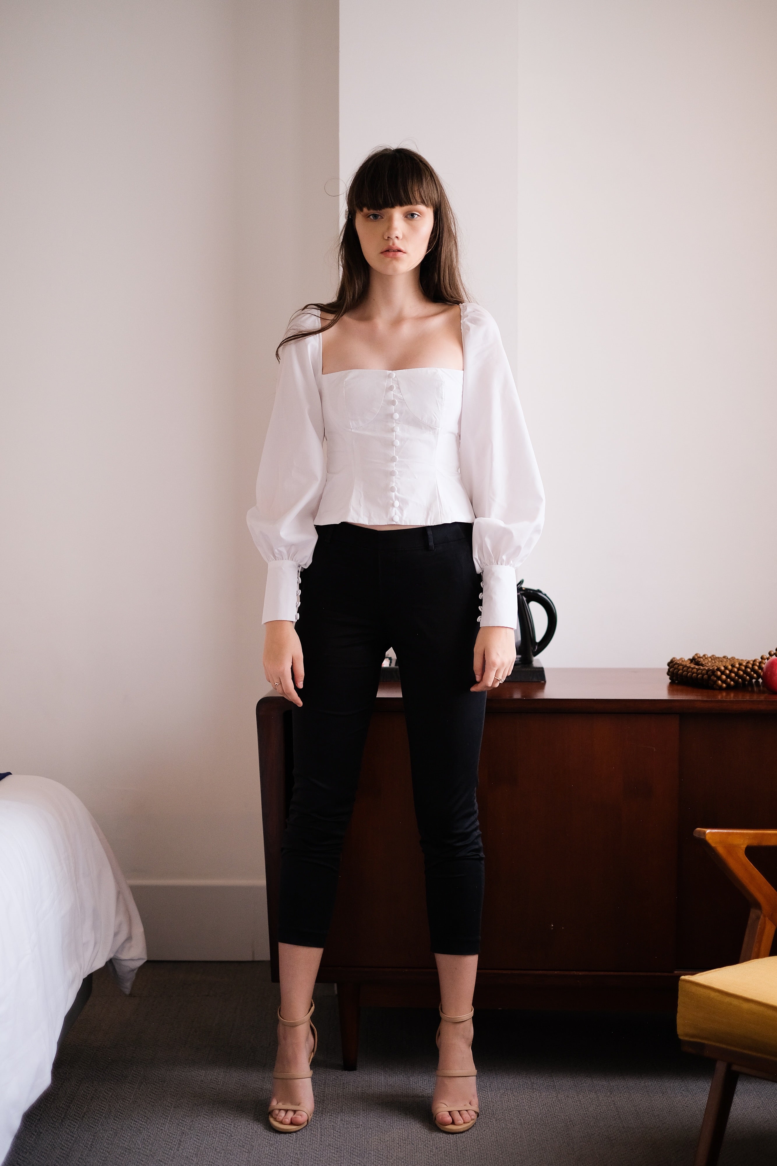 CORSET TIGHT TOP, MEANT TO BE TIGHT FITTED (NO STRETCH) PUFFY SLEEVES FRONT DECORATIVE BUTTONS SHIRT CUFF FULLY LINED OPEN-ENDED ZIPPER AT THE BACK